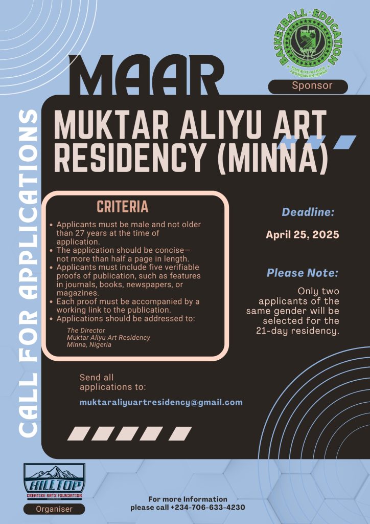 The Muktar Aliyu Art Residency (MAAR) is now accepting applications for its 2025 cohort. Organized by the Hill-Top Creative Arts Foundation and sponsored by the Timeout4Africa, this 21-day residency offers a unique opportunity for emerging male creatives under 27 to focus on their craft in a supportive environment.