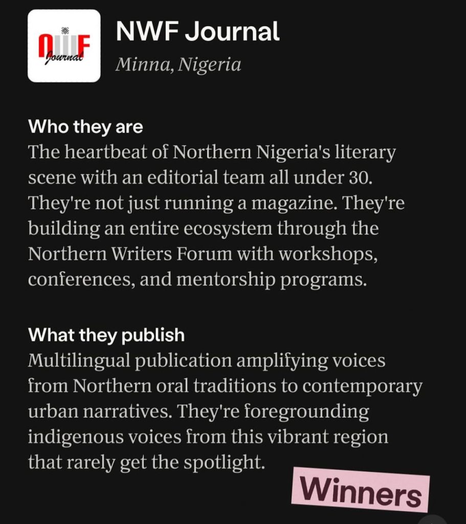 “This grant is not just about funding,” said Ibraheem Uthman, Managing Editor of NWF Journal. “It’s about validation, that a magazine run by young editors from Northern Nigeria has a place in the global literary space. We are building something sustainable, and we are building it our way.”